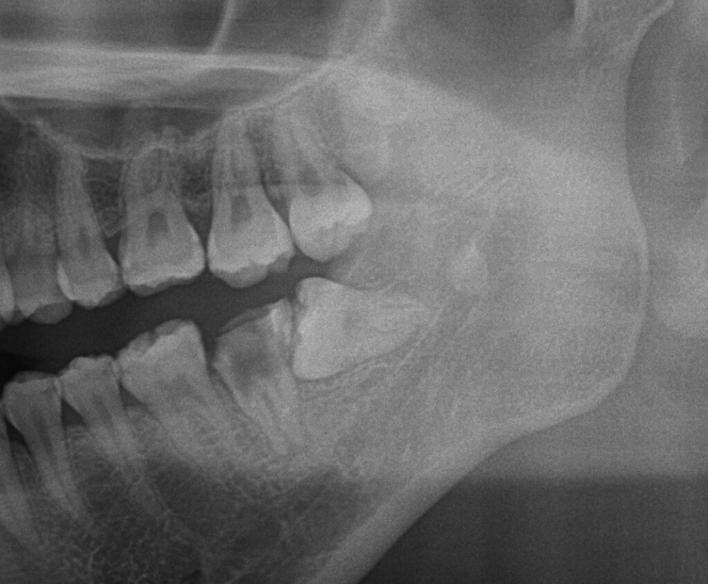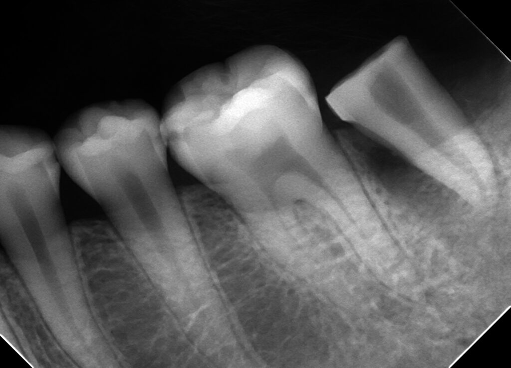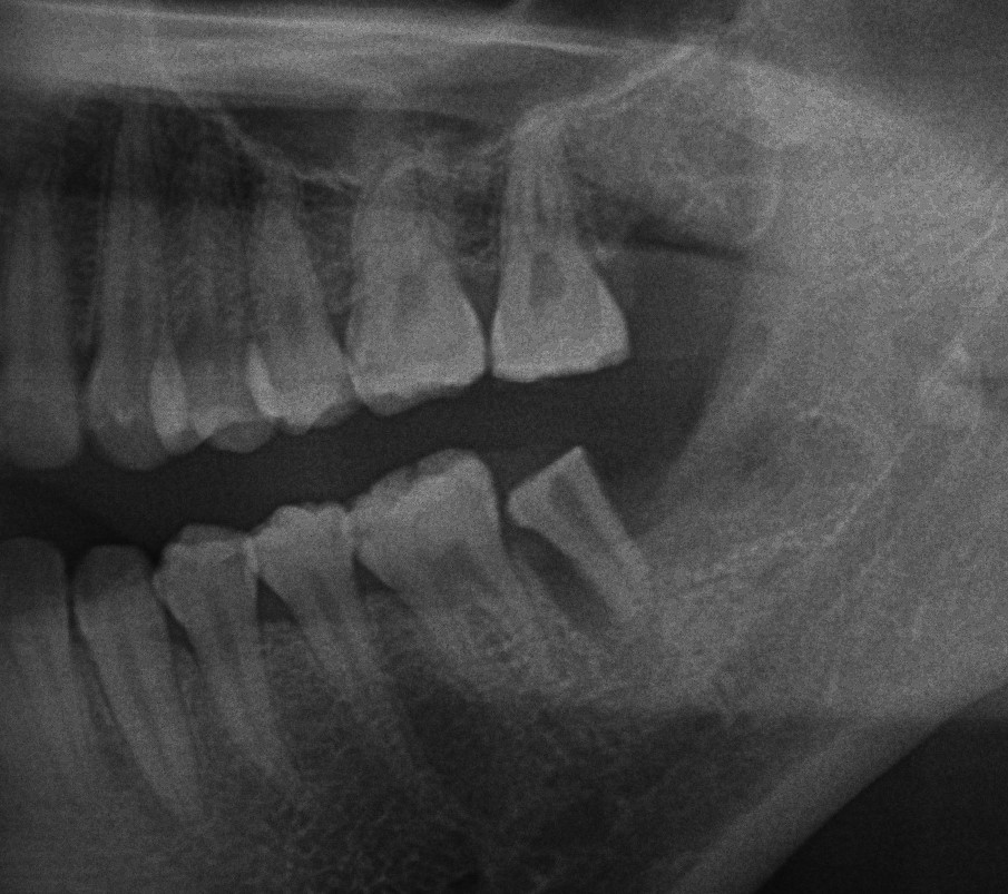 このレントゲンは術前のレントゲンで左下7番目の歯がボロボロで保存不可能なため抜歯をして左上8を左下7の部位に移植する計画を立てました。